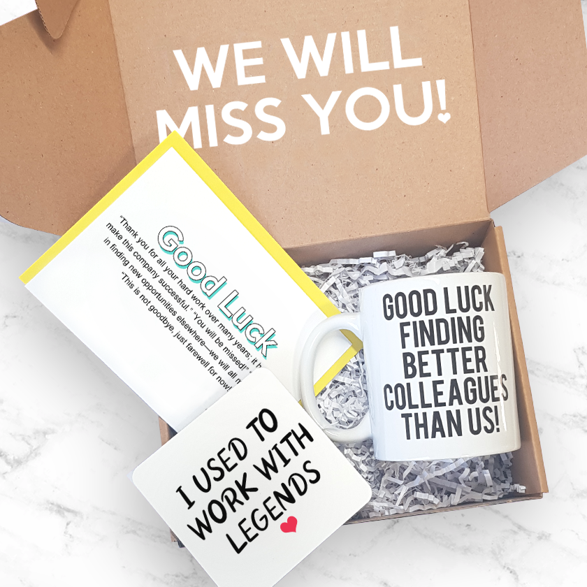 Box contains a leaving mug with a coaster and your message with envelope . We will also add the name of the recipient to the front of the box.